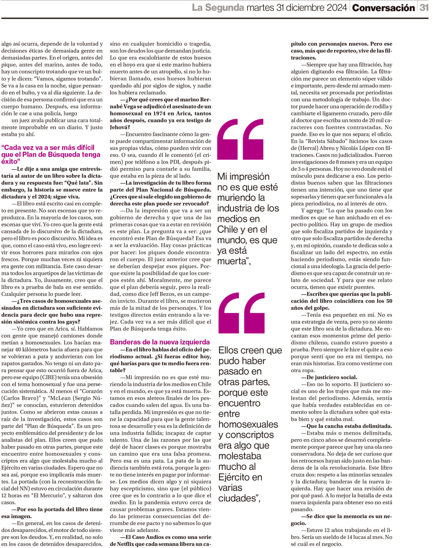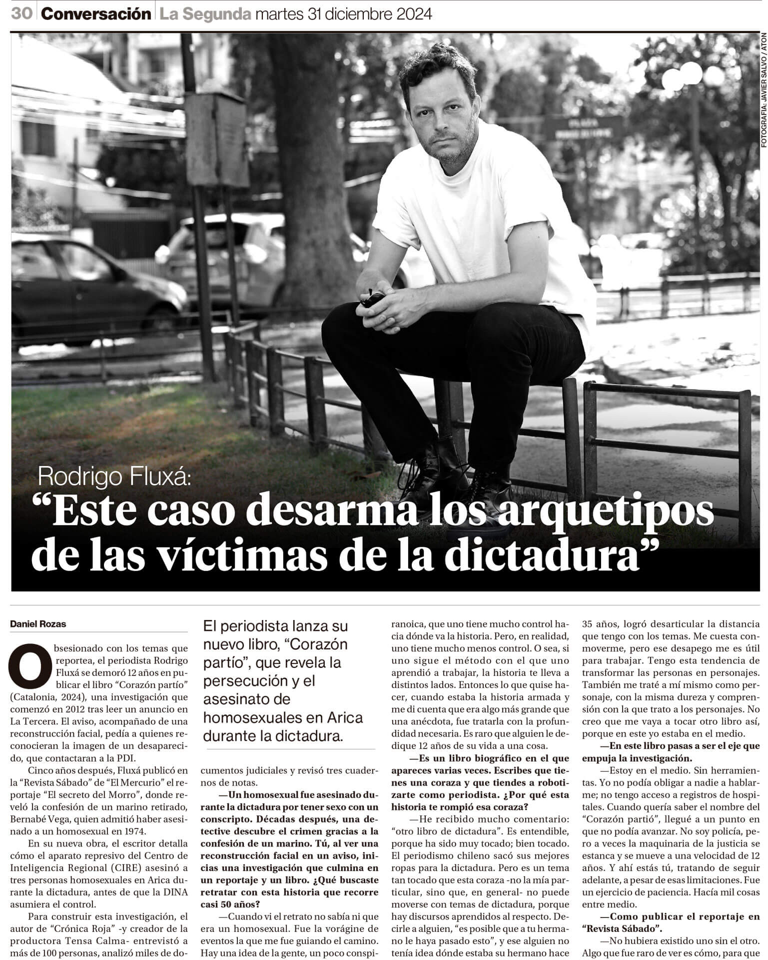 «“He recibido mucho comentario: “otro libro de dictadura”. Es entendible, porque ha sido muy tocado; bien tocado. El periodismo chileno sacó sus mejores ropas para la dictadura. Pero es un tema tan tocado que esta coraza –no la mía particular, sino que, en general– no puede moverse con temas de dictadura, porque hay discursos aprendidos al respecto. Decirle a alguien, “es posible que a tu hermano le haya pasado esto”, y ese alguien no tenía idea dónde estaba su hermano hace 35 años, logró desarticular la distancia que tengo con los temas. Me cuesta conmoverme, pero ese desapego me es útil para trabajar”, dice el periodista Rodrigo Fluxá en entrevista con La Segunda».