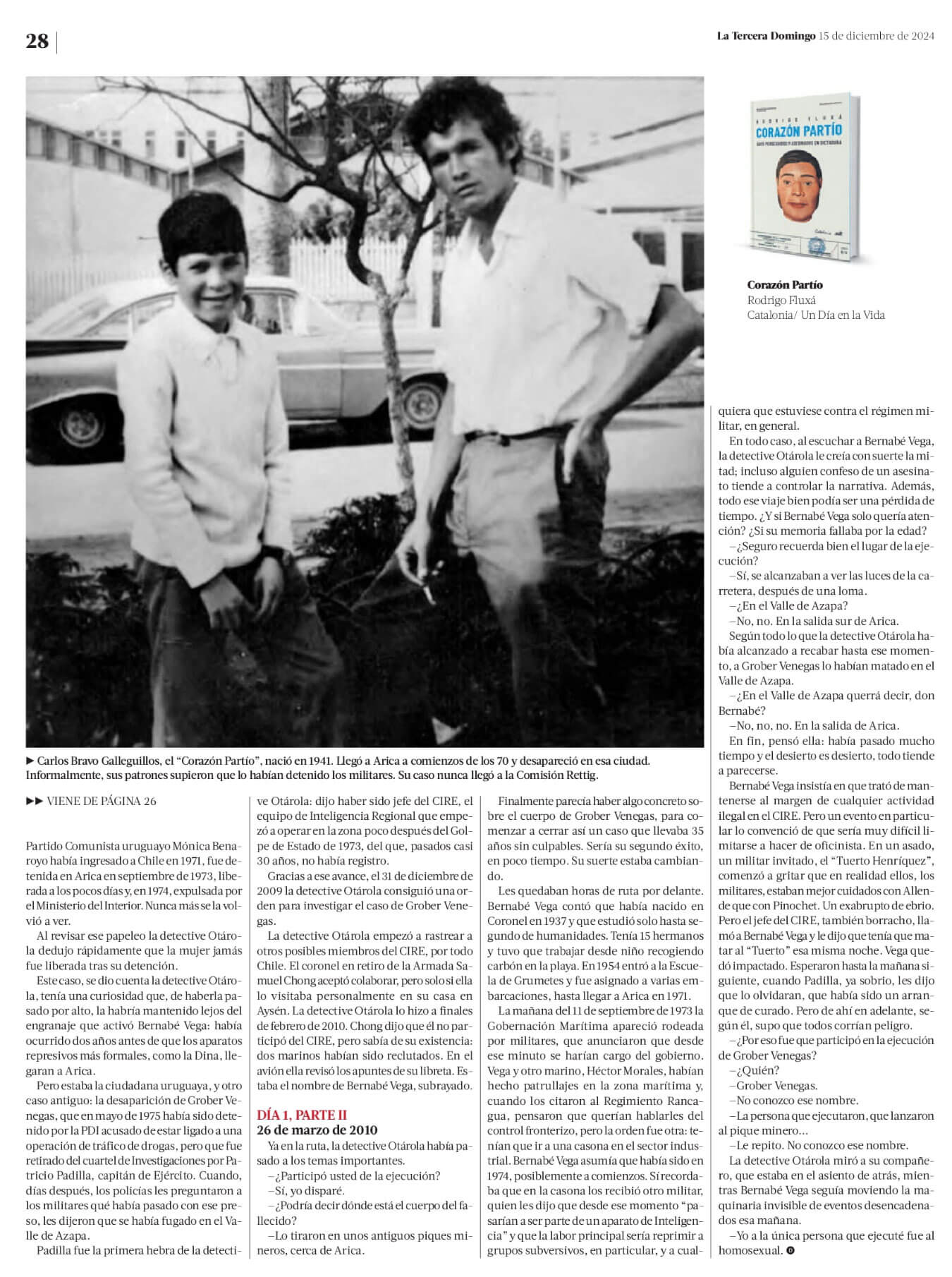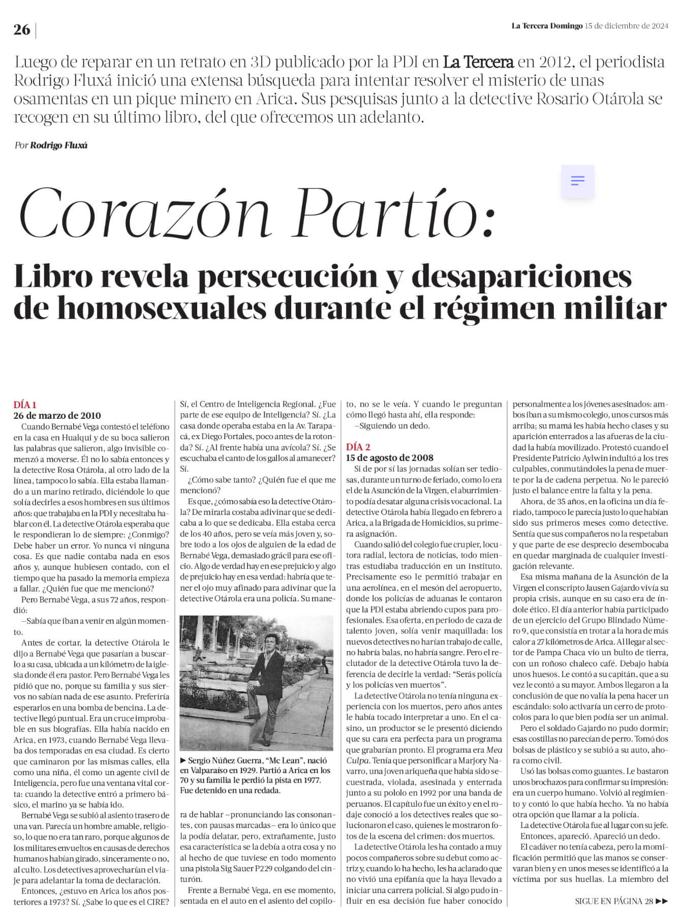 «Luego de reparar en un retrato en 3D publicado por la PDI en La Tercera en mayo de 2012, el periodista Rodrigo Fluxá inició una búsqueda de 12 años para intentar resolver el misterio de unas osamentas en un pique minero en Arica. Acompañado por la detective Rosa Otárola, las pesquisas se recogen en su último libro, Corazón partío, que revela una secreta cacería contra gays en esa ciudad nortina en los 70. ¿Reconoces el rostro en su portada?» Leer aquí.